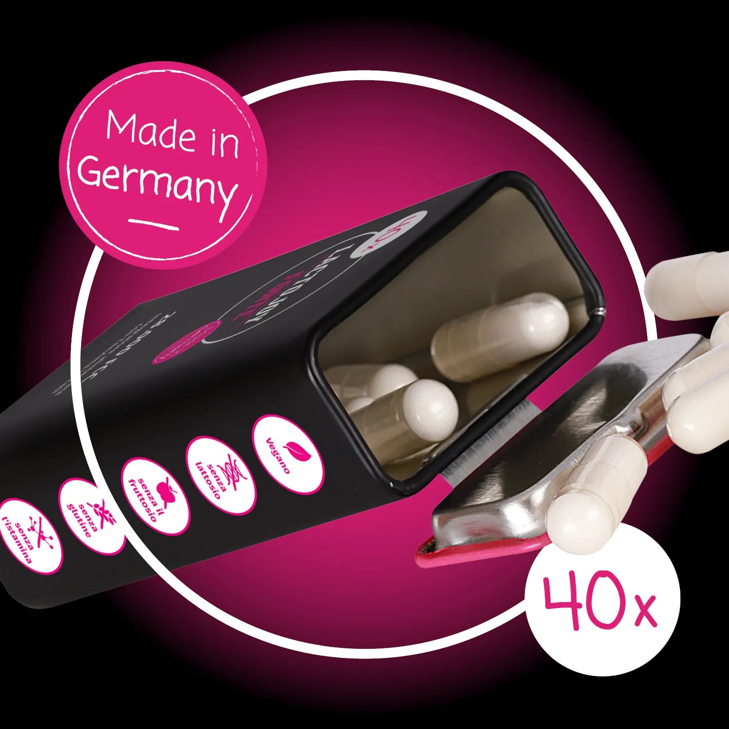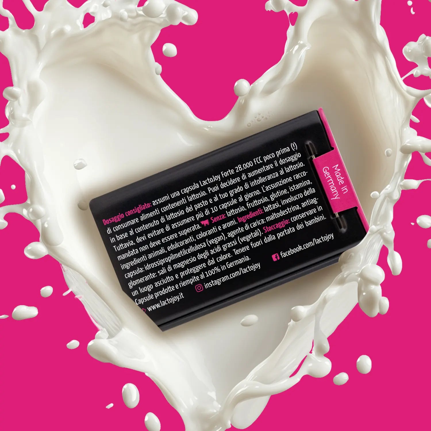 Durante la creazione di LactoJoy è stato fondamentale per noi, che la nostra capsula fosse piccola e facile da ingerire. Abbiamo voluto fortemente ideare una delle più piccole compresse di lattasi presente sul mercato con un alto dosaggio, dal gusto neutro e naturalmente priva di aromi artificiali. Ma la qualità non si ferma solo alla capsula. L'elegante e pratica confezione e il moderno design ci suggeriscono che l'intolleranza al lattosio non è affatto una malattia, ma la normalità. La nostra slider nera è infatti comoda per essere portata sempre con sè e si allontana dalle obsolete confezioni di medicinali.