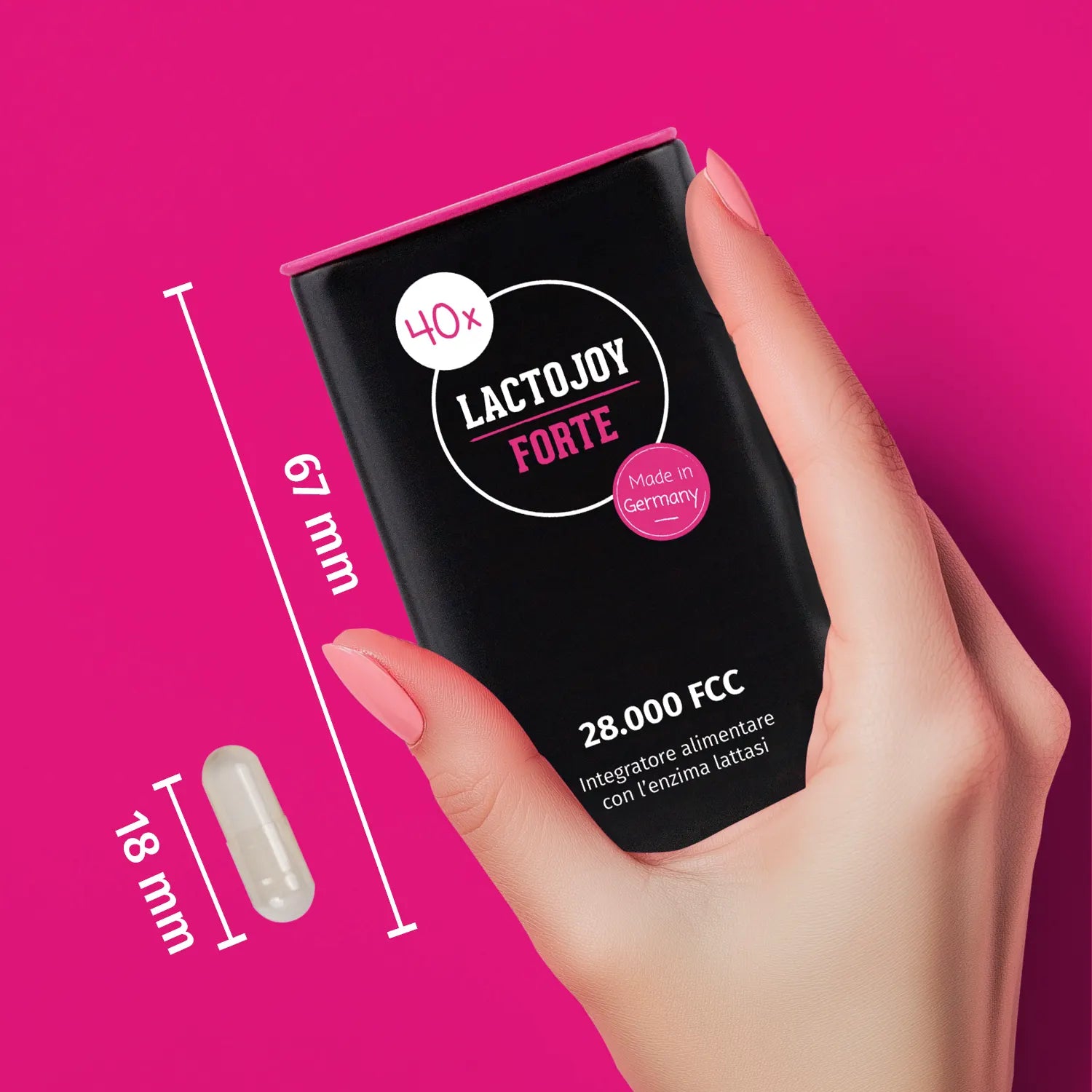 LactoJoy contiene inoltre un dosaggio abbastanza alto di 28.000 unità FCC. Ciò ti consente un'efficacia elevata. Dal momento che la lattasi non può essere sovradosata e non ha effetti collaterali, e dal momento che non è mai possibile sapere con certezza la quantità di lattosio presente nel pasto, meglio prendere una capsula in più per evitare spiacevoli sorprese. Se invece desideri un dosaggio inferiore, puoi semplicemente dimezzare la capsula LactoJoy grazie alle linee di pre-rottura.