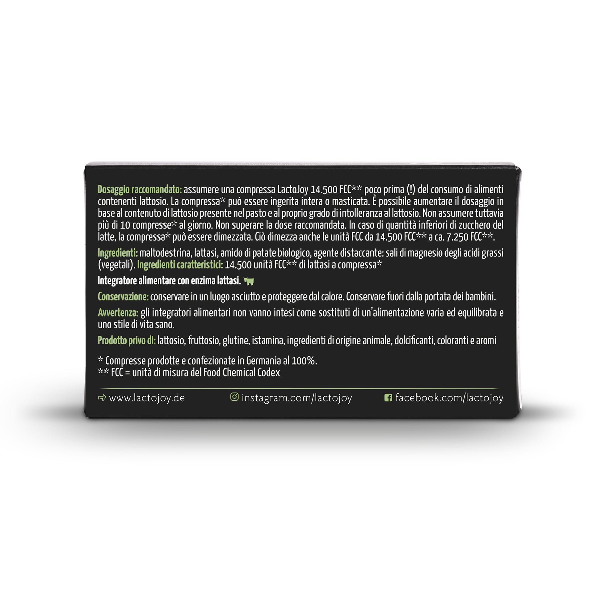 Posologia: Assumere una compressa LactoJoy poco prima di pasti contenenti lattosio. Le compresse vanno masticate o ingerite intere. È possibile aumentare il dosaggio in base al contenuto di lattosio presente nel pasto e al proprio grado di intolleranza al lattosio. Non bisogna assumere più di 10 compresse come dose giornaliera. Non superare la dose raccomandata. Se si desidera un dosaggio inferiore, si può semplicemente dimezzare la compressa LactoJoy grazie alle linee di pre-rottura. Ciò dimezza anche le unità FCC da 14.500 FCC** a ca. 7.250 FCC**.